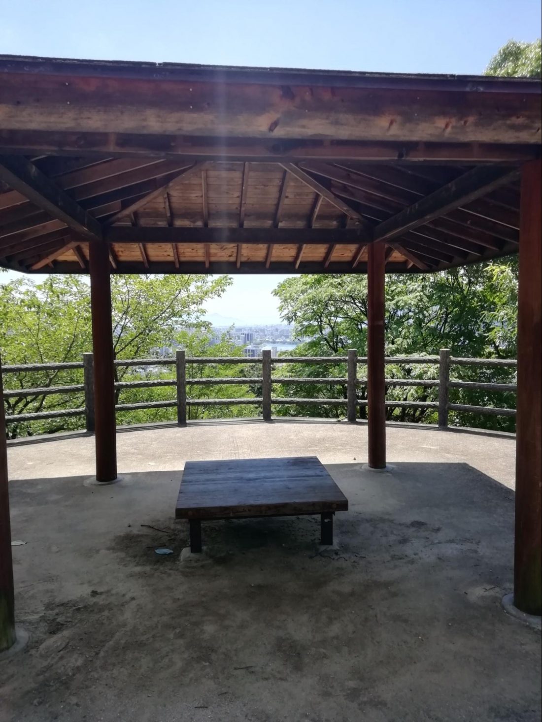 The third moment of joy came when dropping one more level down and finding a whole area of benches and pavilions with great views still far yet above the city, and yet also just about a 10-15 minute walk up from Hiroshima’s east ward sports center (called Big Wave) and the beautiful “Bara Koen” (Rose Park – a must see when the roses are in full bloom). I have been to both of those locations many times and never knew that 10 minutes away were these pavilions. I’ll be picnicking and relaxing there come autumn!