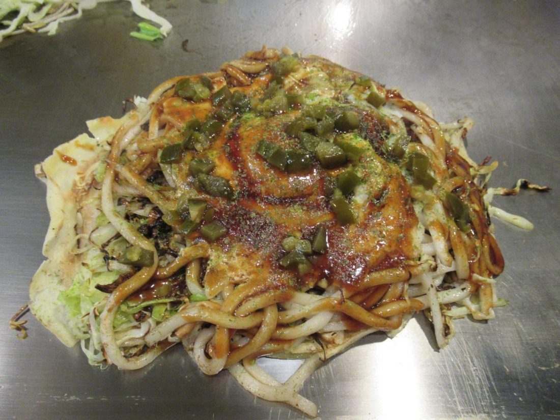Soon after placing my order, I graciously received permission to photograph and record the cooking process. The method of making okonomiyaki isn’t new to me, but I was simply impressed by how skillfully the team of cooks coordinated and juggled so many people’s orders, constantly switching between serving the customers right before them and stuffing items into containers for take-out customers to immediately pick up. Eventually, I came across my own okonomiyaki and caught footage of them finishing up and topping my order with their signature jalapeños.