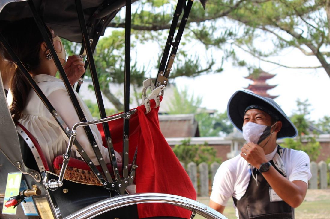 EBISUYA Miyajima offers a service that allows visitors to tour Miyajima on a rickshaw (a traditional Japanese transportation method). The Ebisuya rickshaw not only takes you to your destination but also provides you with a tour guide who can tell you more about Miyajima and its attractions. There are four different courses to choose from, and each course has a maximum capacity of two people per rickshaw (two rickshaws will be used to guide three or more people).