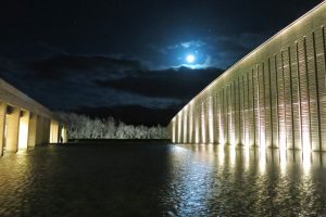 The Okuda Genso Sayume Museum was designed so that the moon can be seen from the lobby of the museum, respecting the world view of Okuda Genso, who painted many Japanese paintings with the moon as a motif. This makes it possible to take beautiful pictures at night, where the moon seems to be floating on a surface of the water in the lobby. On full moon nights, many visitors enjoy photographing and viewing the moon.