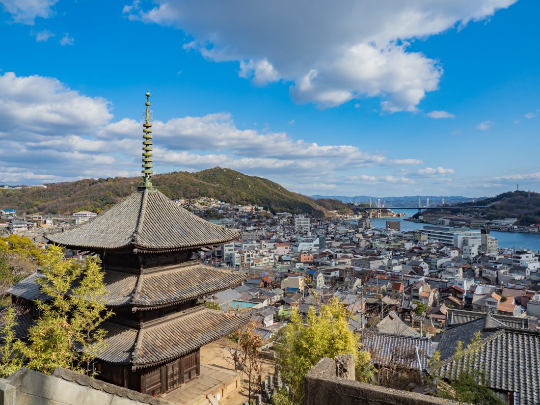 Senkoji Temple is one of the most popular tourist attractions in Onomichi. The temple is located halfway up Mt. Taiho and is said to have been built about 1,200 years ago. The vermilion-lacquered main hall, also known as the “red hall,” is said to be unique in its beauty and has been preserved in many postcards and photographs since ancient times. The Senkoji ropeway, which departs from the foot of the mountain, is a convenient way to get to Senkoji. It takes about three minutes to reach the mountainside where Senkoji Temple is located.